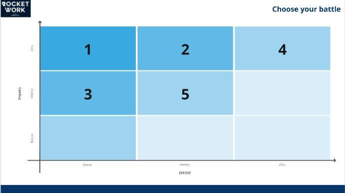 Posizionate poi le attività in base ai valori che avete ottenuto su ciascuna in una matrice (sotto quella che usiamo noi con i nostri clienti). Nel quadrante 1, ad esempio, avrete quelle attività che hanno effort = 1 e impact = 3